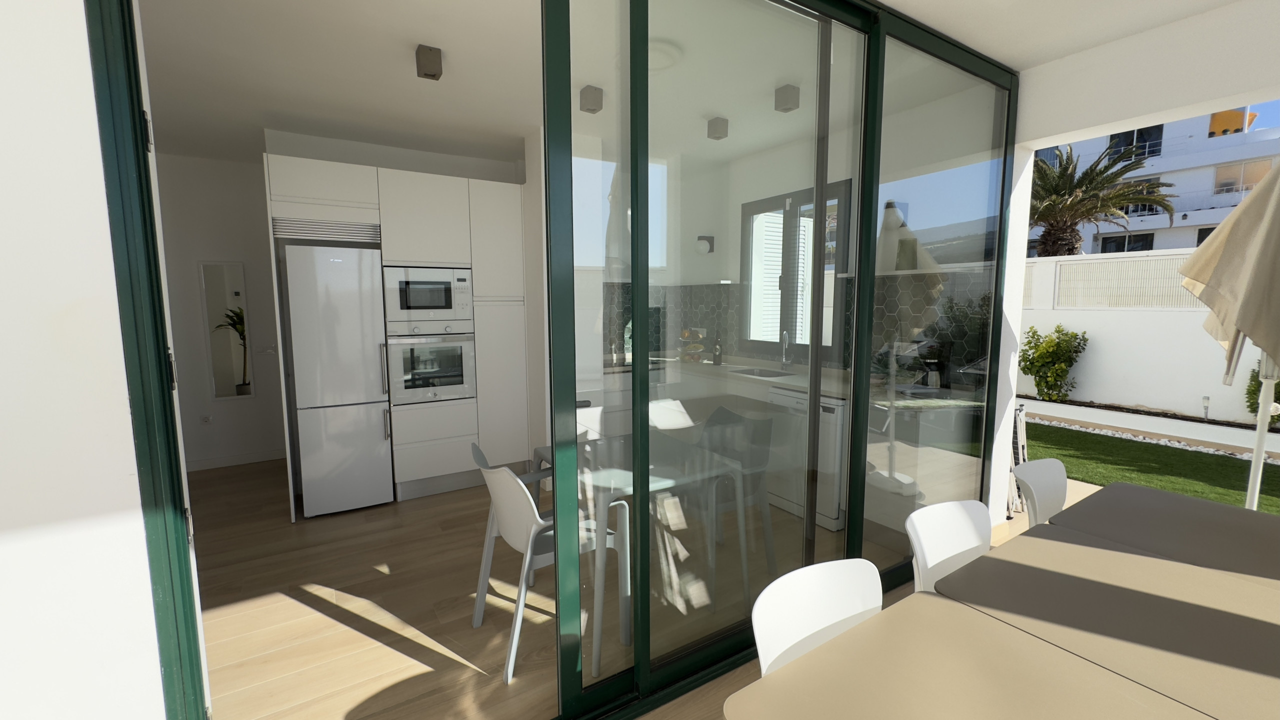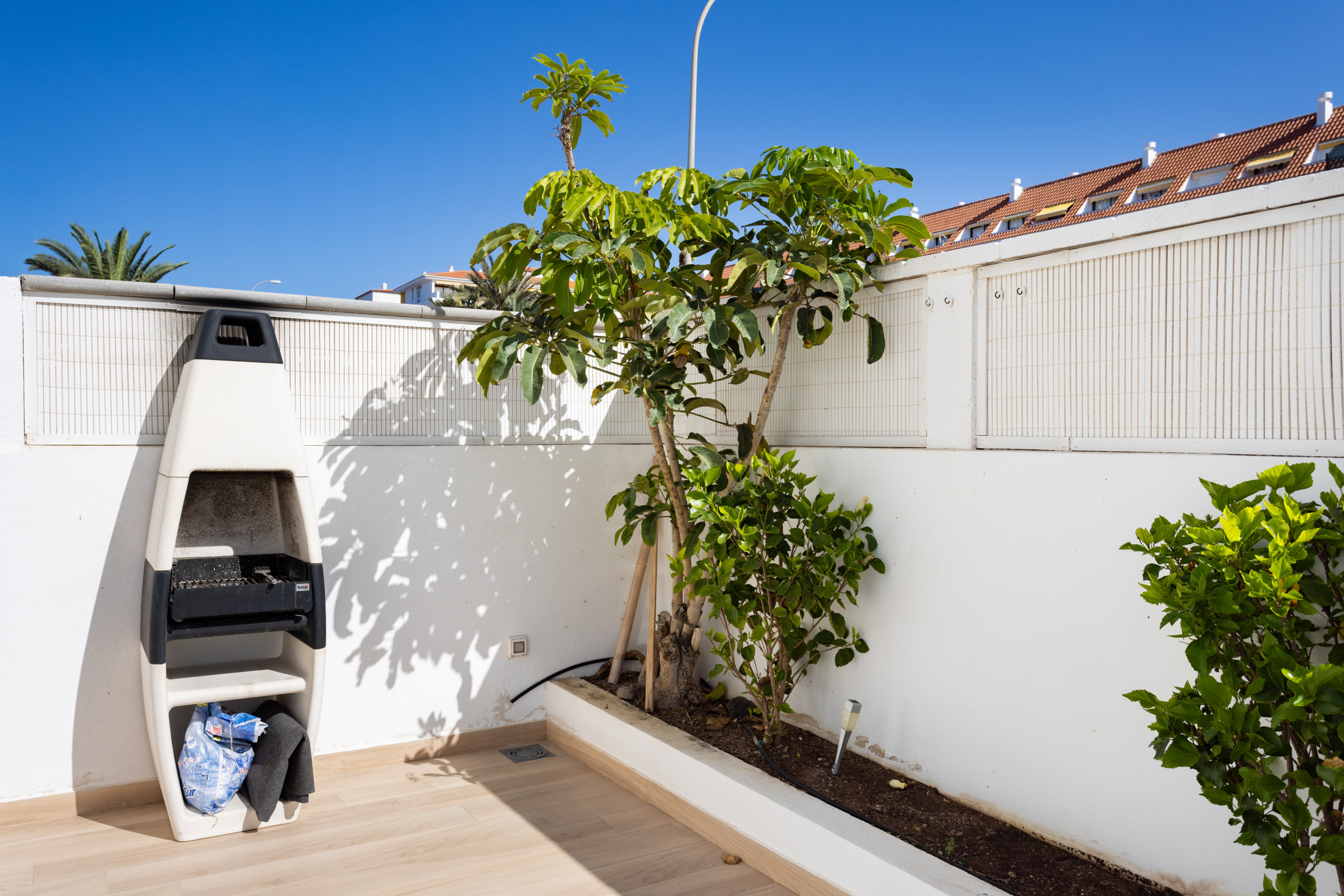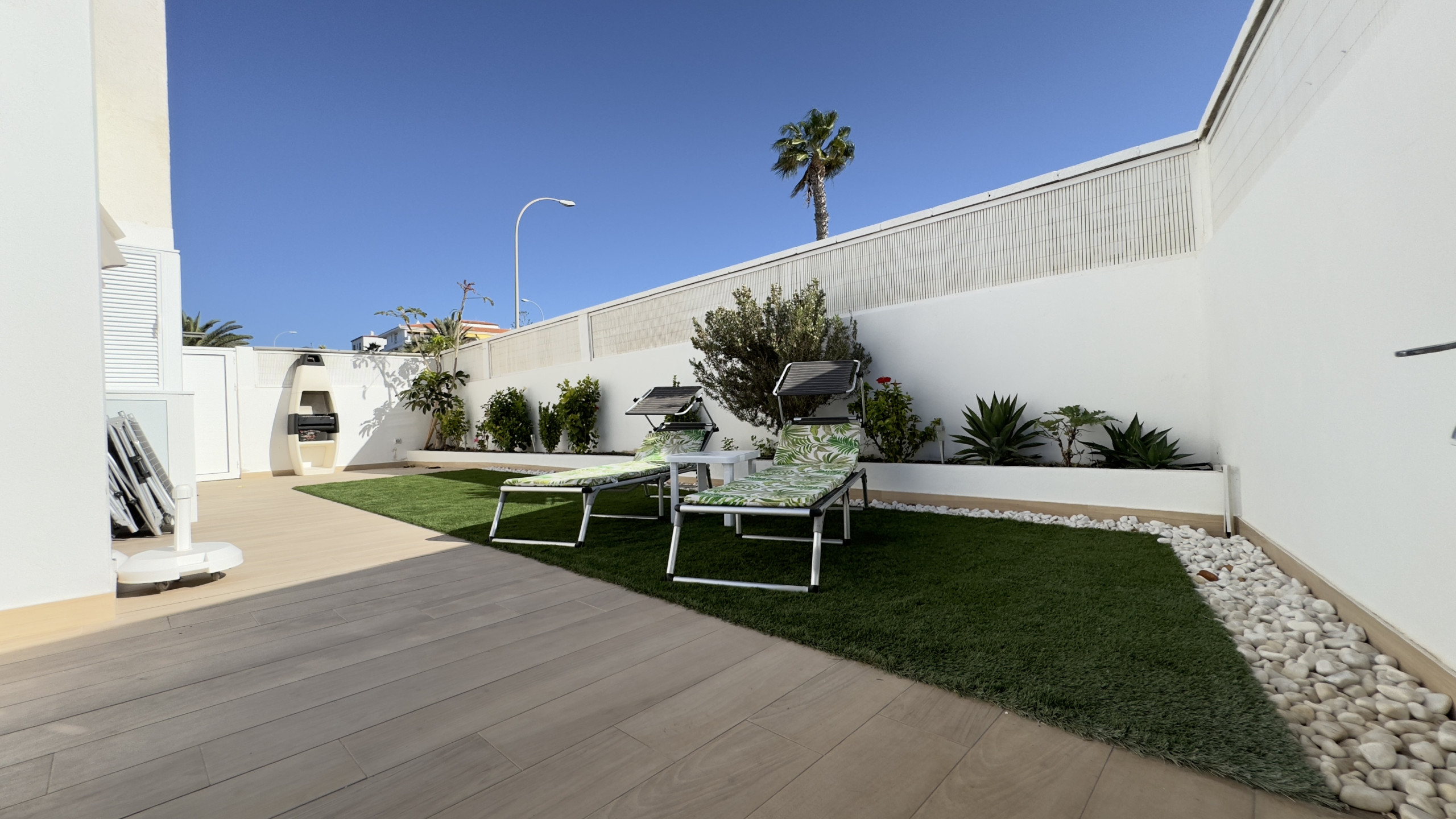 El espacio exterior es amplio y muy agradable, con tumbonas, zona de barbacoa y una mesa perfecta para comidas al aire libre.