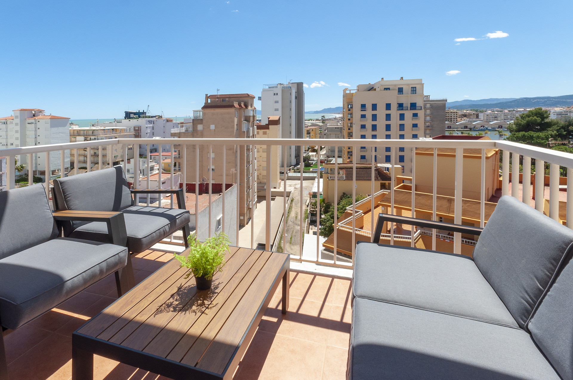 La terraza, junto al salón, es un espacio muy importante y la hemos amueblado con unos sillones relax porque a eso hemos venido, a relajarnos en nuestras vacaciones en Gandia. También tenemos toldos en la terraza.