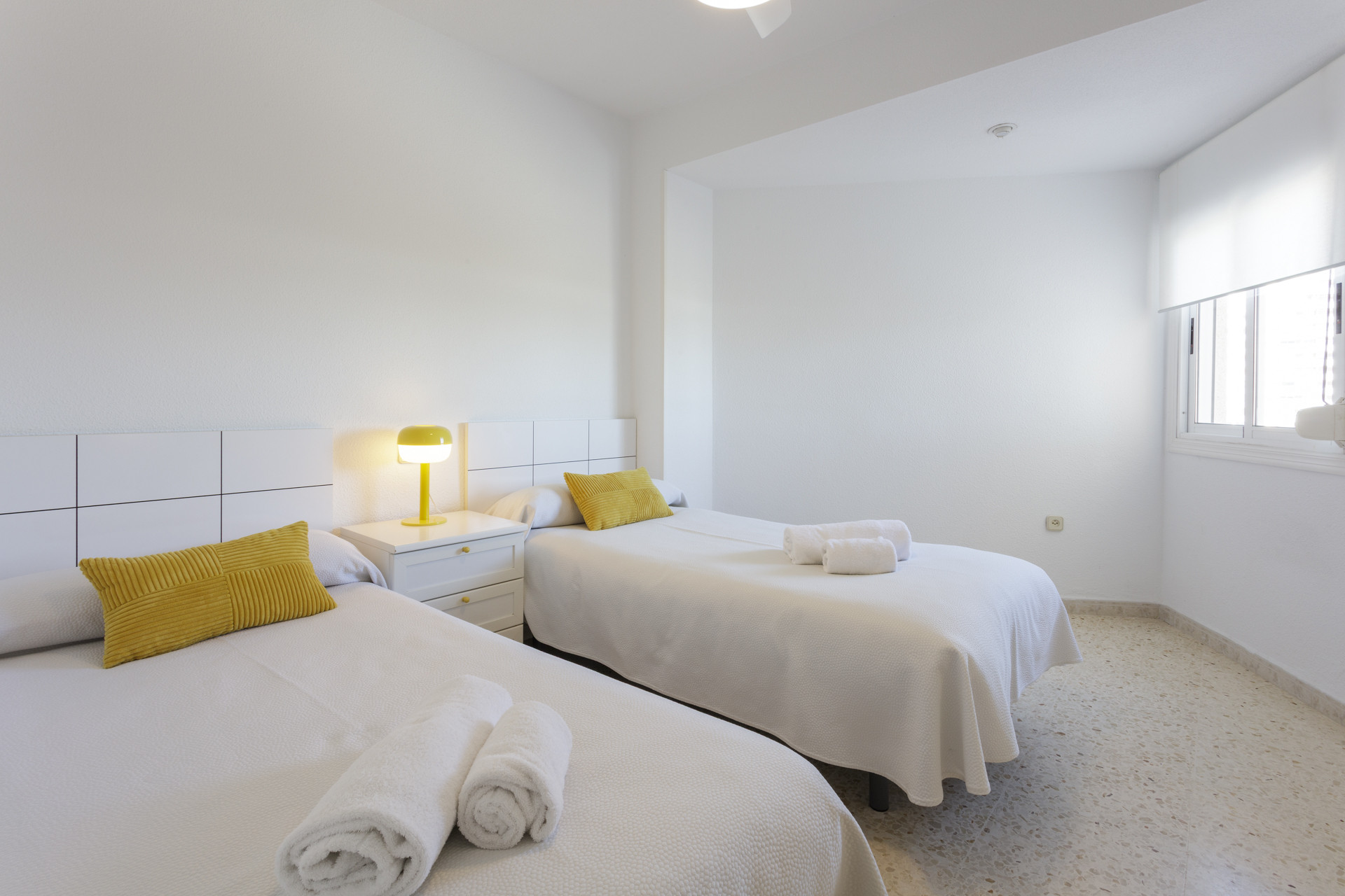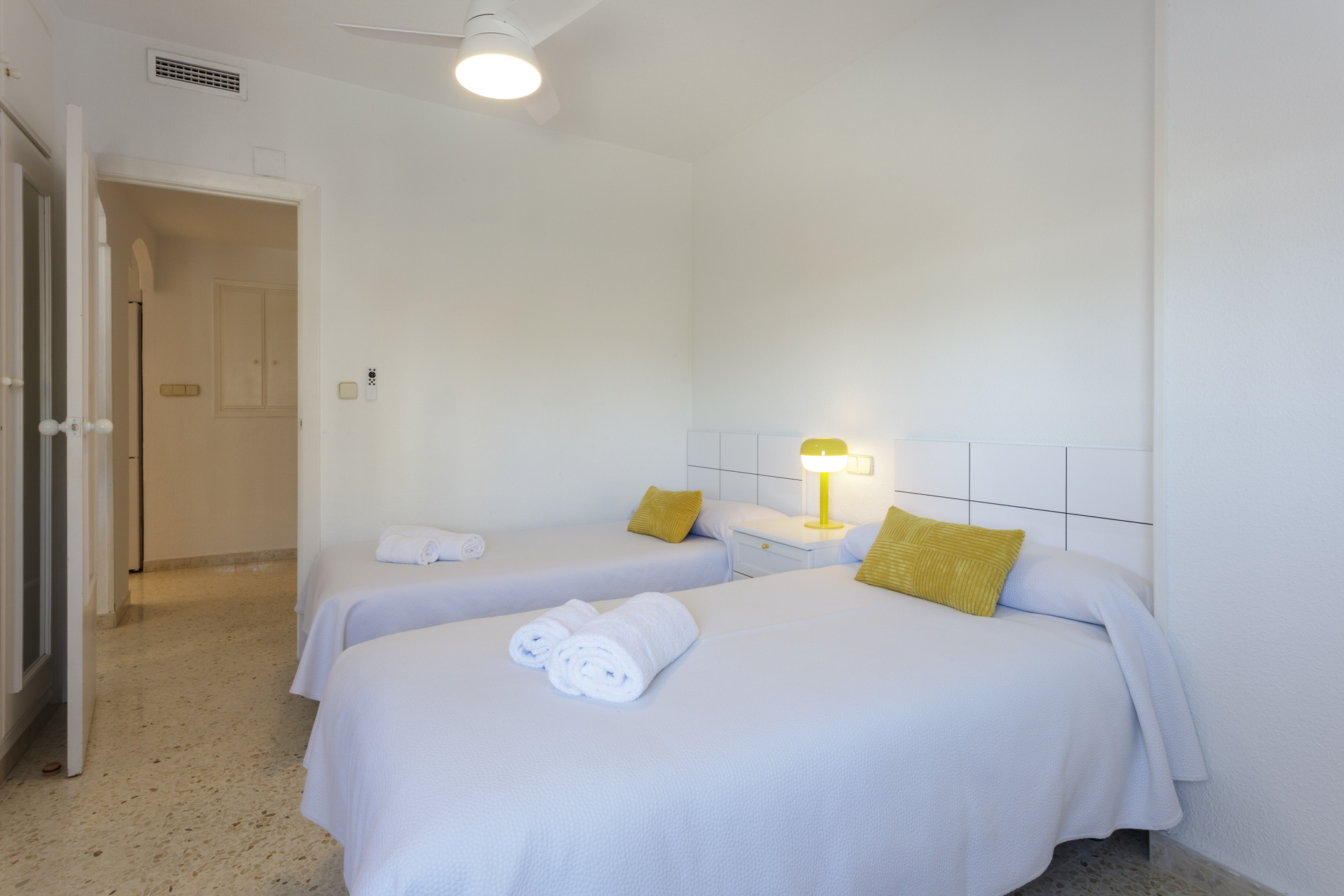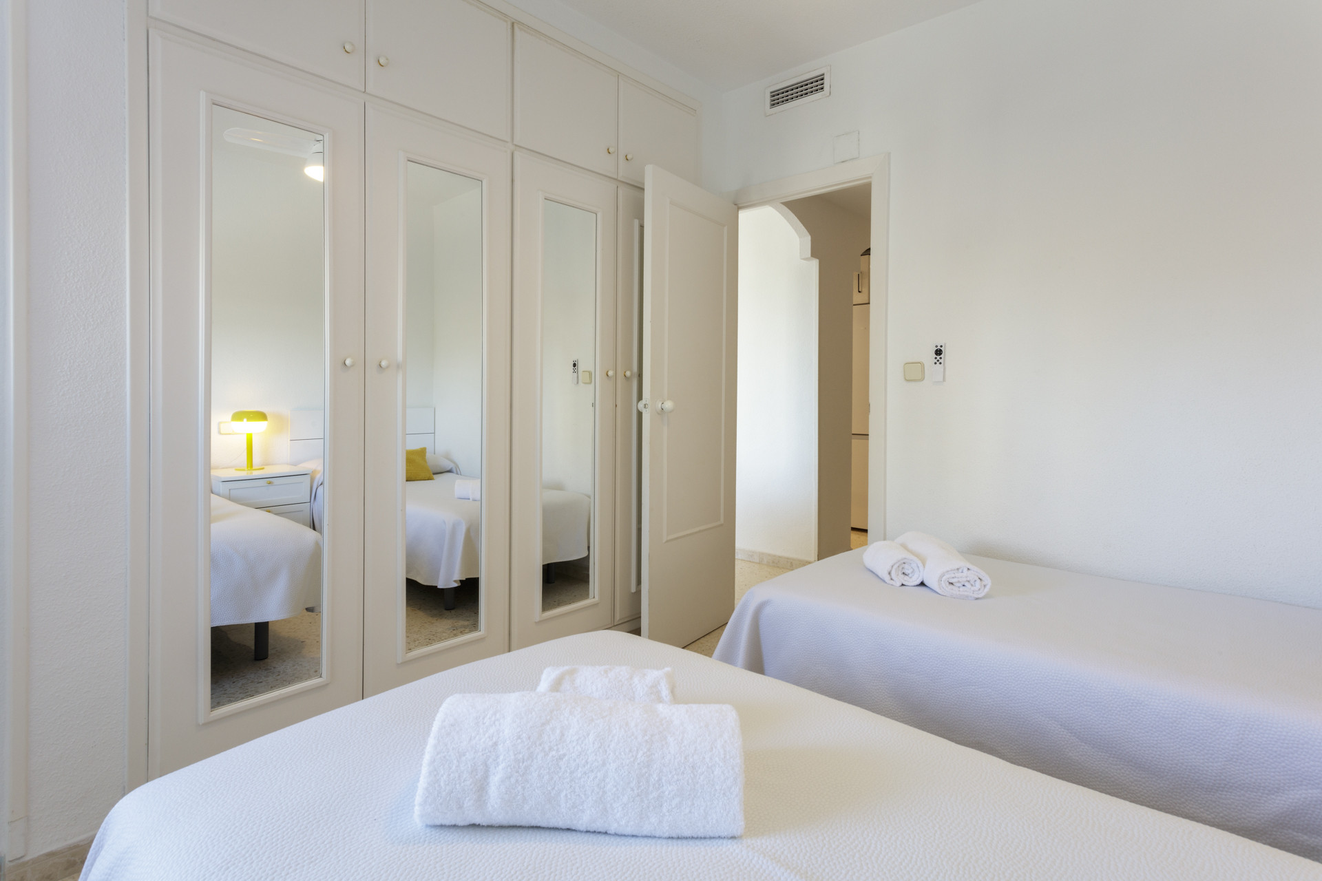 El apartamento tiene una superficie de 90 m² y está distribuido en tres dormitorios, dos baños, un salón-comedor y una cocina completa. Los dormitorios están equipados con armarios empotrados y aire acondicionado. Los baños están equipados con ducha para el fácil acceso. El salón-comedor tiene una gran televisión. La cocina está equipada con todos los electrodomésticos necesarios, como nevera, congelador, horno, vitrocerámica, lavadora y lavavajillas.