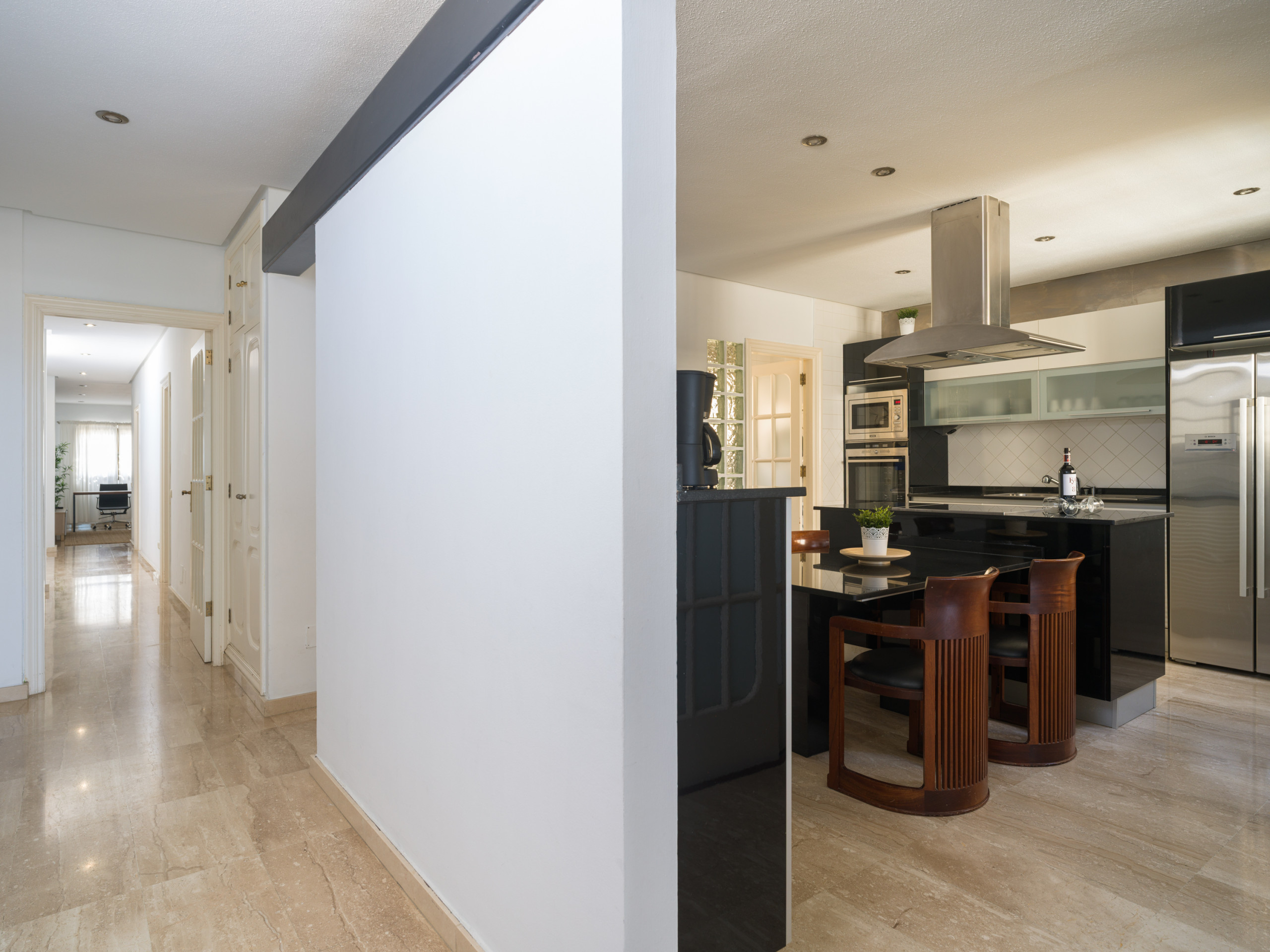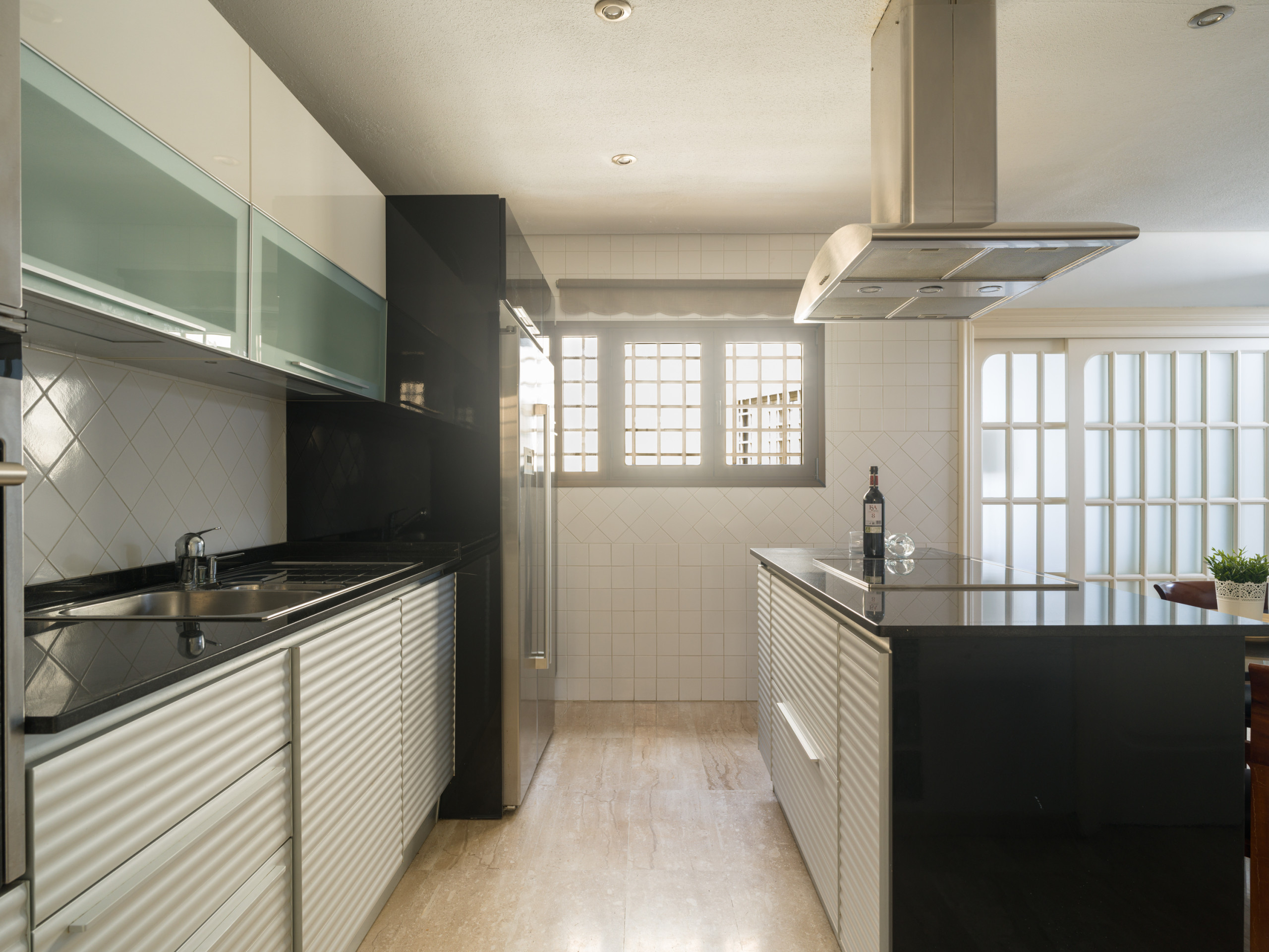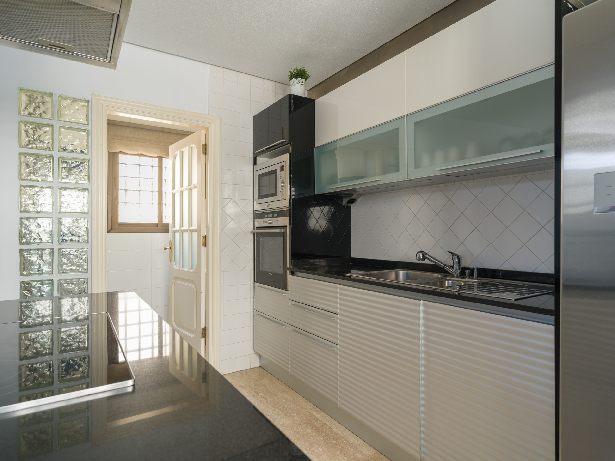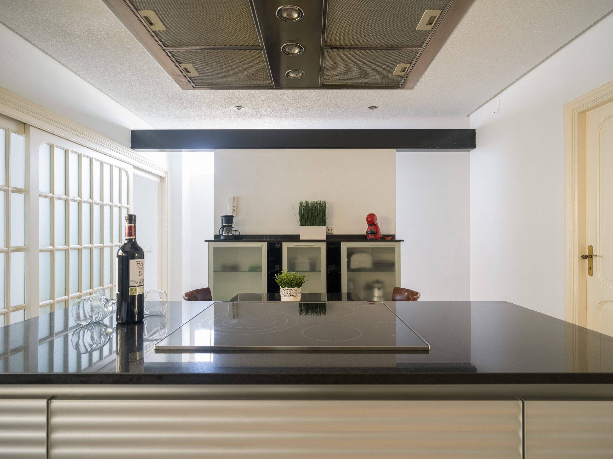 Cocina independiente de vitrocerámica que tiene nevera, microondas, horno, congelador, lavadora, secadora, vajilla, cuberteria, utensilios de cocina, cafetera, tostadora, hervidor de agua y exprimidor. También dispone de ascensor, plancha, conexión wifi, secador, televisor y radio.