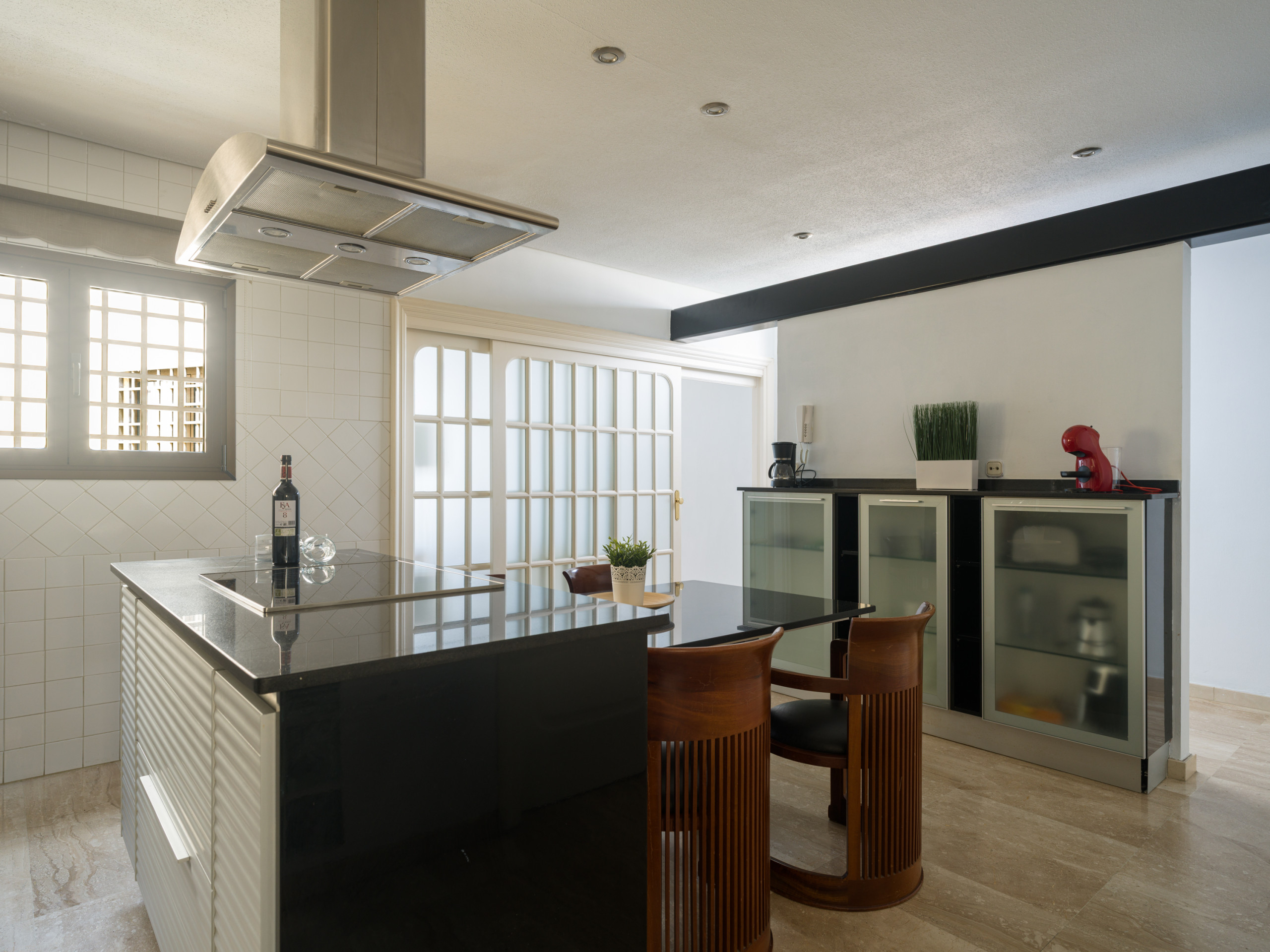 La cocina totalmente equipada está diseñada con elegancia y cuenta con electrodomésticos modernos, como una nevera, horno, microondas, lavavajillas y pequeños electrodomésticos. También cuenta con una isla y amplia barra con cuatro taburetes confortables. Los huéspedes tienen todo lo que necesitan para preparar cualquier tipo de comida y disfrutar de ellas en el comedor adyacente, que ofrece un espacio acogedor para reunirse alrededor de la mesa y con vistas al mar.