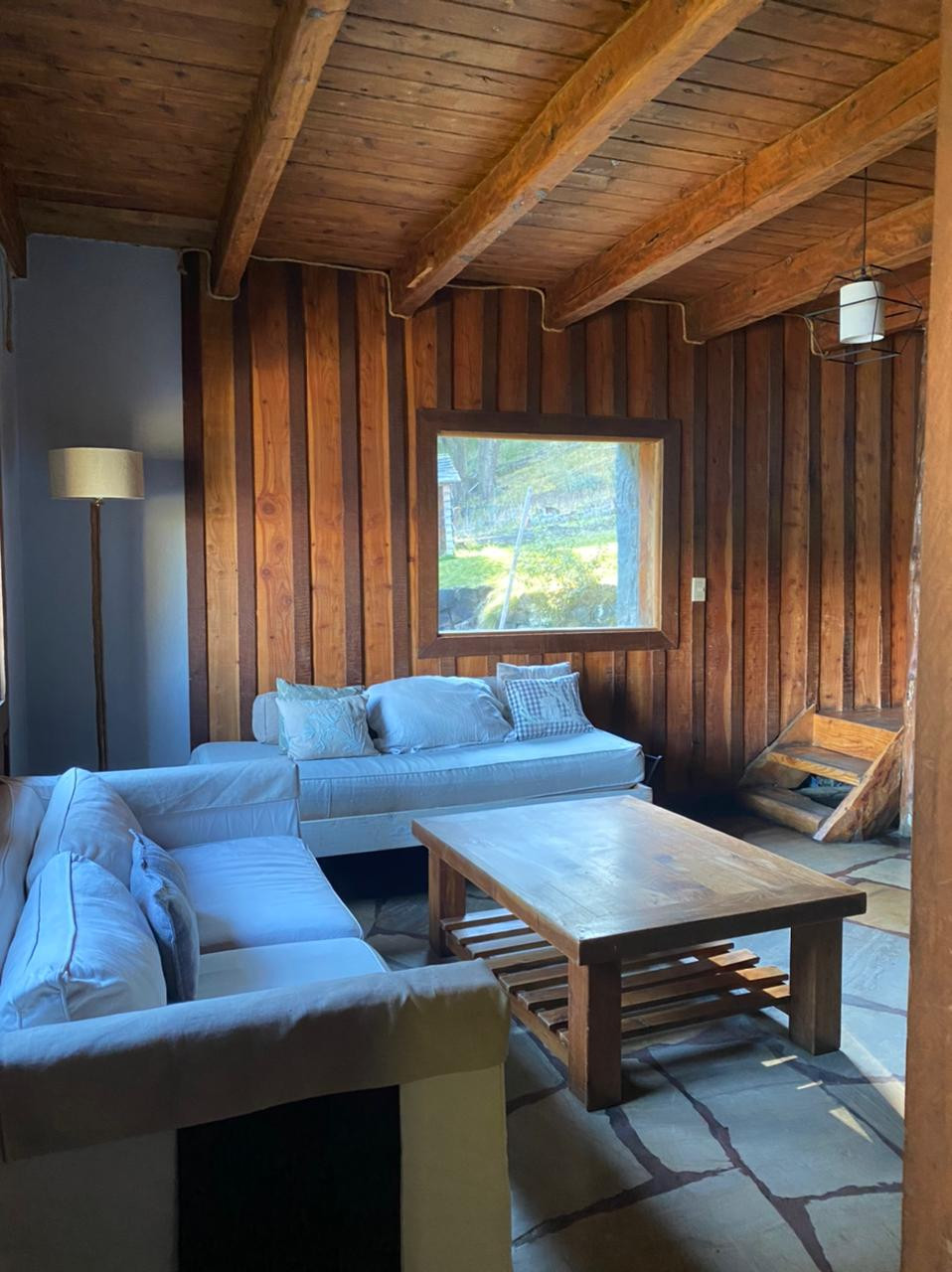 * Living con hogar, deck y vista al lago