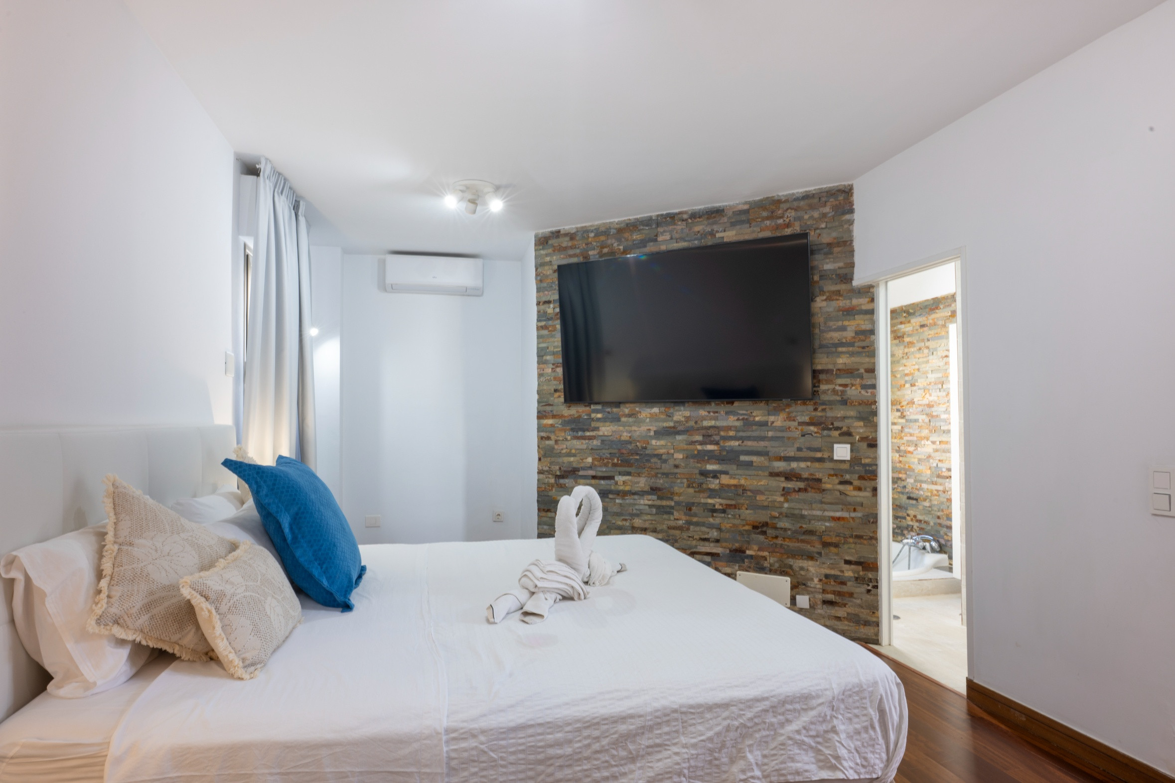 Suite principal: cama King 2x2, TV de 75”, baño en suite con bañera y vistas privilegiadas.