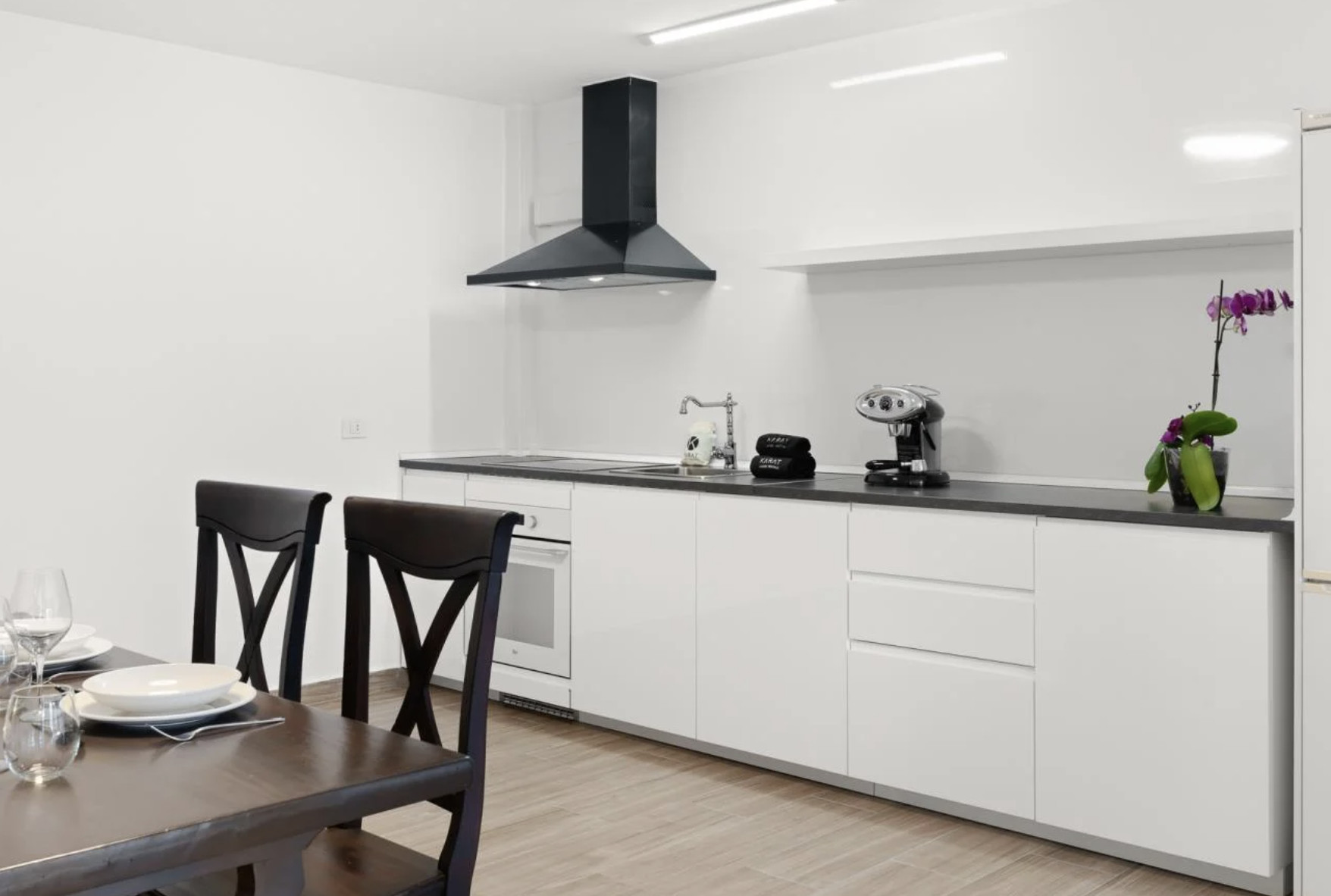 En la planta baja, un encantador apartamento con entrada independiente ofrece la posibilidad de alojar invitados o personal con total privacidad. Está comunicado internamente con la villa y dispone de cocina, comedor, sala de estar, un dormitorio con cama doble de 150x190 cm y un baño completo con plato de ducha.