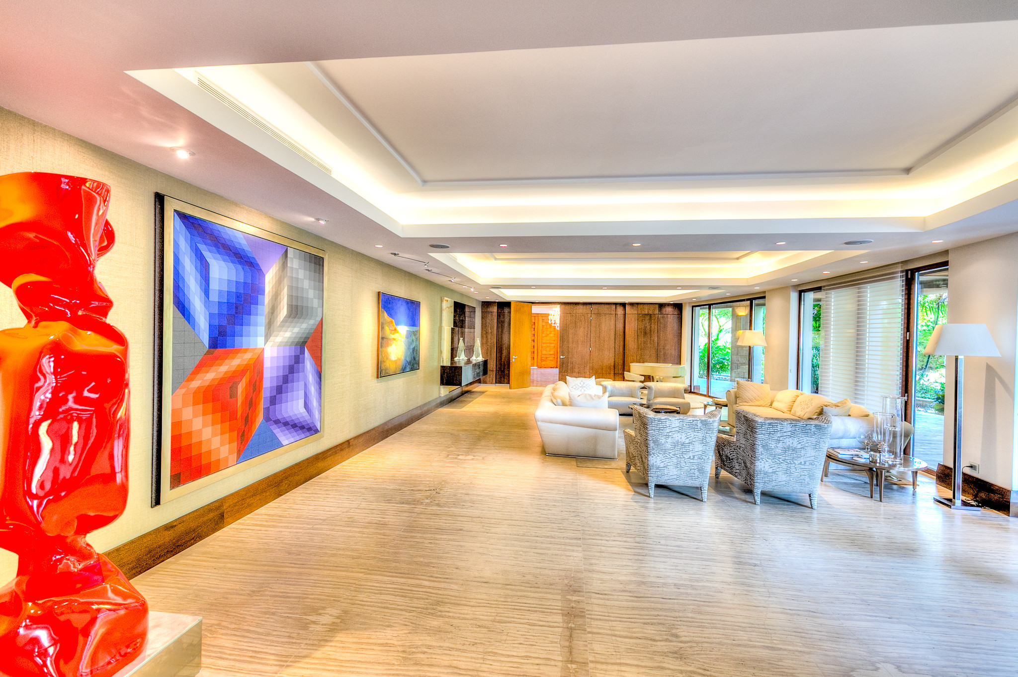 Esta espectacular propiedad presenta un diseño moderno con toques vanguardistas. Su impresionante vestíbulo de techos altos destaca por una escalera de caracol futurista con barandilla de cristal, flanqueada por dos esculturas que custodian la entrada principal. Un impactante candelabro formado por miles de piezas de vidrio en forma de gotas da la bienvenida a todos los visitantes, creando una primera impresión inolvidable.