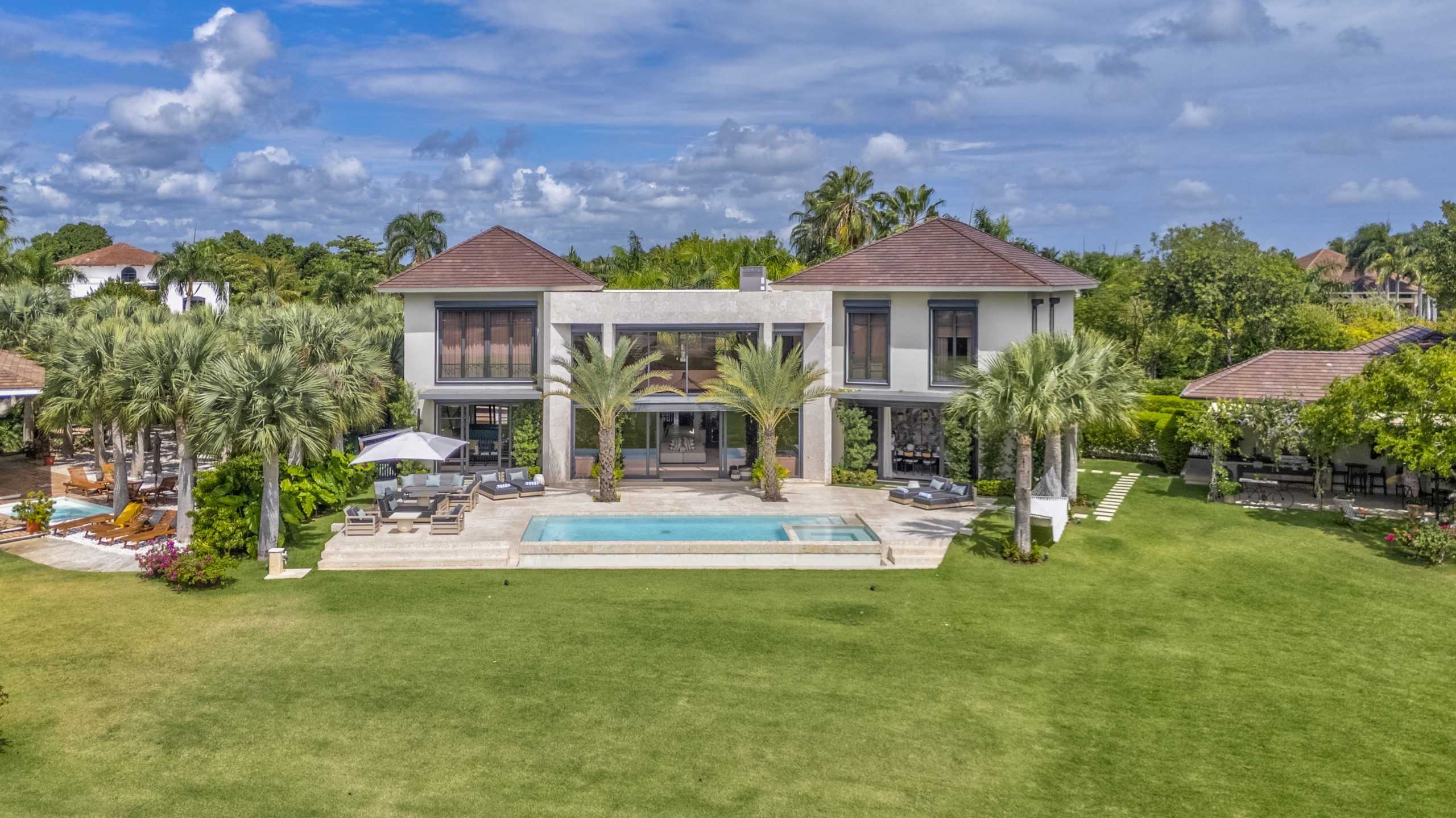 La villa se encuentra en la exclusiva comunidad cerrada Puntacana Resort & Club, a solo diez minutos del Aeropuerto Internacional de Punta Cana. El complejo ofrece más de 26 millas cuadradas de playas, áreas verdes, restaurantes, actividades deportivas y un ambiente de lujo caribeño.