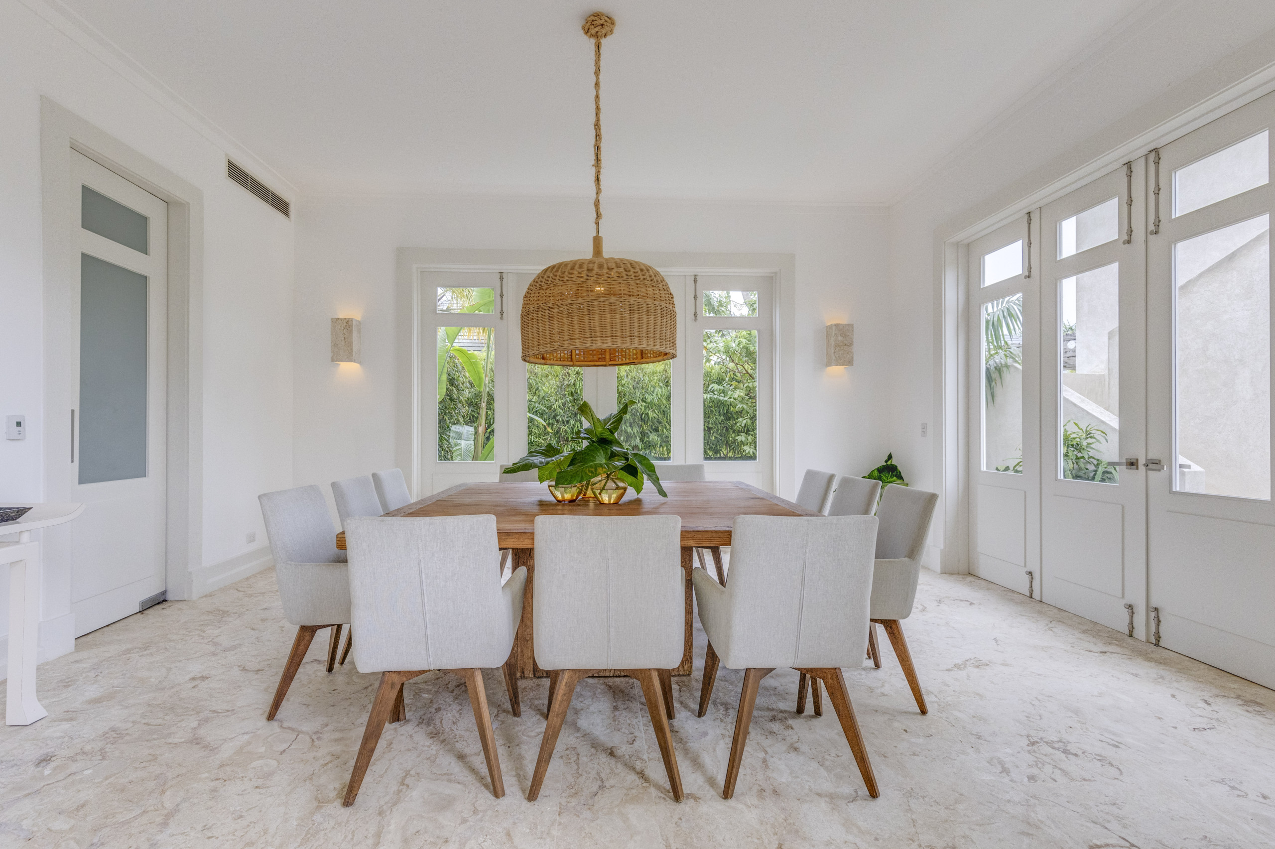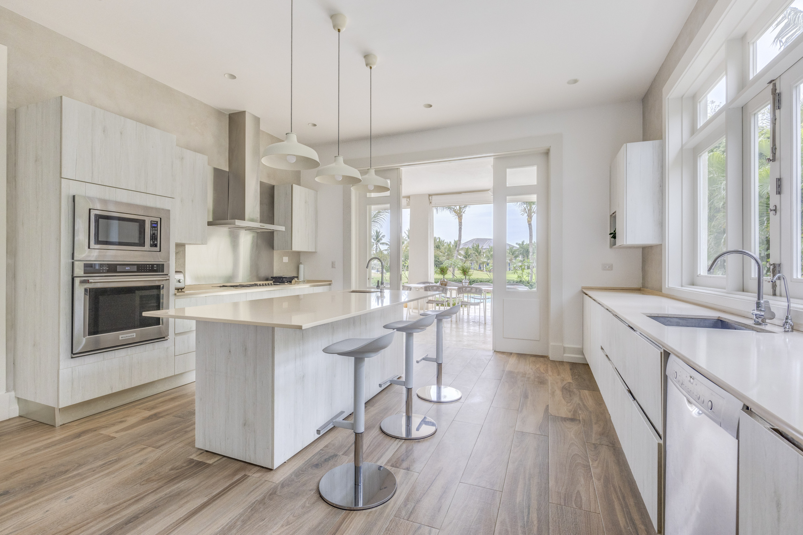 Al entrar por la puerta principal, un espejo de agua que refleja el sol caribeño candoroso rodeado de azulejos de coralina es una atracción única antes de entrar al vestíbulo exterior de techos altos con una lámpara de araña masiva tipo linterna y un balcón, escalera al segundo piso y acceso al jardín. La cocina moderna completamente equipada, gobernada por un blanco con rayas grises, ofrece todo lo que necesitas para preparar una comida tradicional dominicana o disfrutar del desayuno en la isla mientras hablas sobre tu día en la playa. Al pasar al área de estar, una lámpara de araña rústica te da la bienvenida para descansar en cualquiera de sus acogedoras sillas de mimbre o en el sofá mientras suaves brisas se cuelan. El área de comedor ofrece asientos para 12 invitados en su gran mesa cuadrada de madera dura.