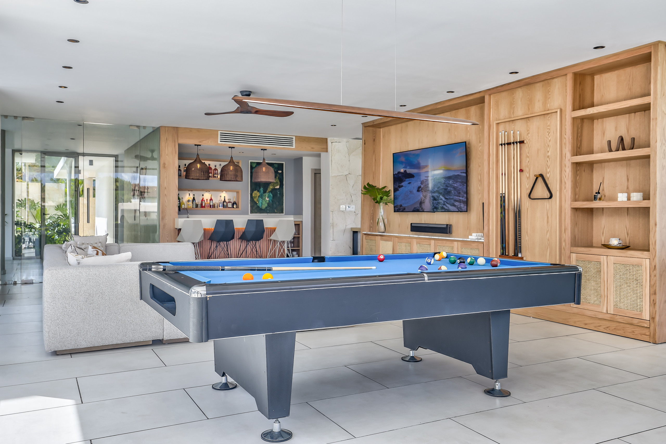 La villa cuenta con una amplia selección de áreas de ocio y bienestar, entre ellas: sauna infrarroja, gimnasio completamente equipado, fire pit, zona de barbacoa, futbolín, mesa de billar, área de juegos infantiles, jacuzzi y piscina climatizable (con coste adicional por noche). También dispone de bicicletas para uso de los huéspedes.