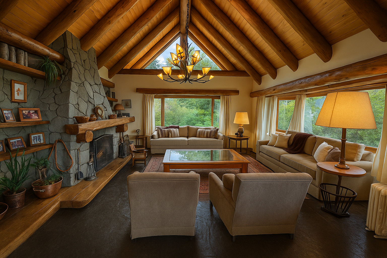 - Large living room with fireplace and gallery