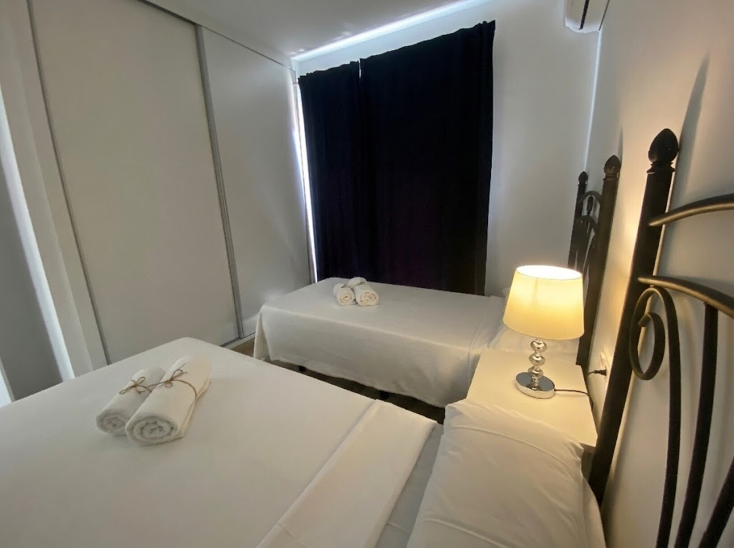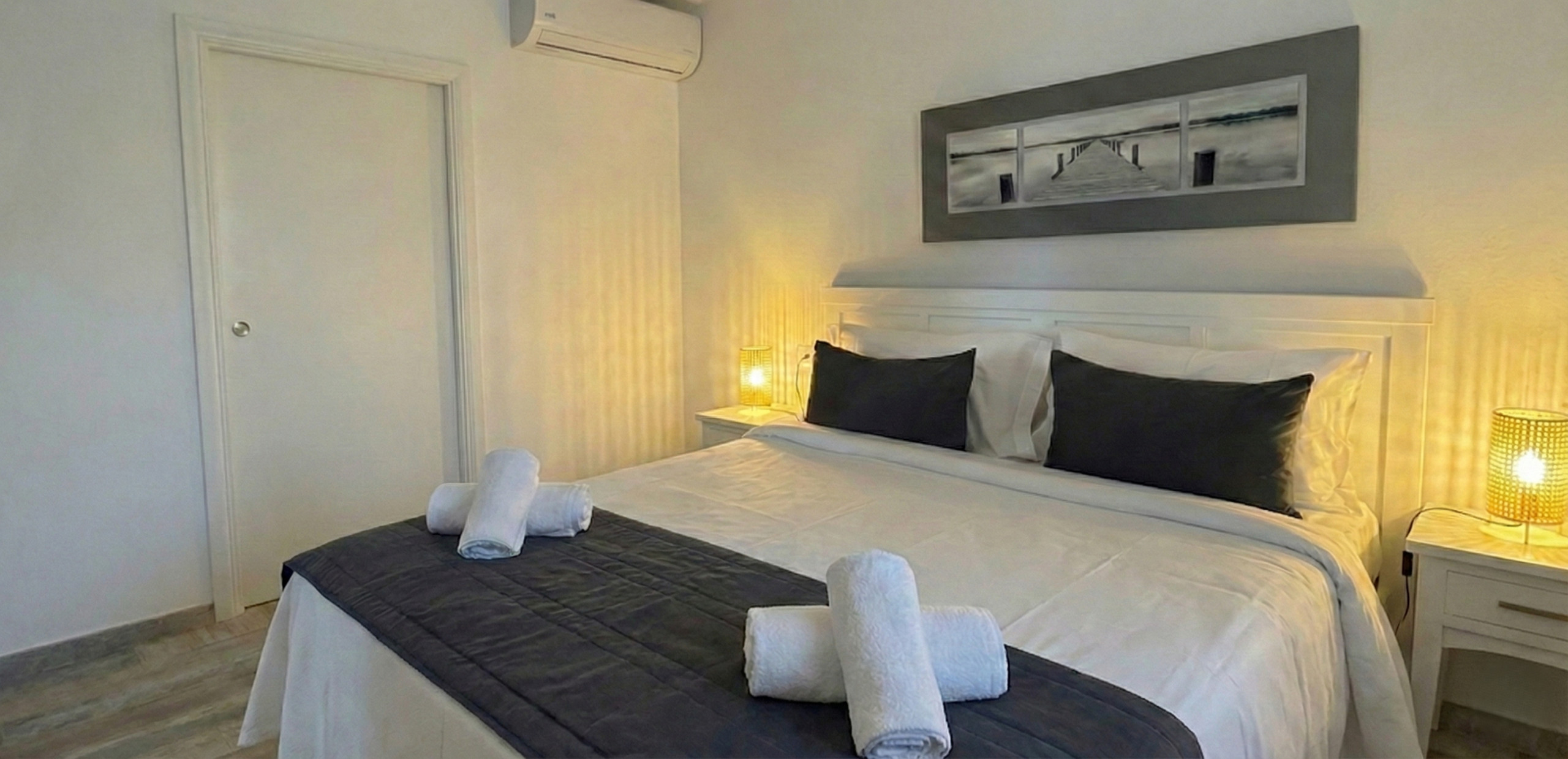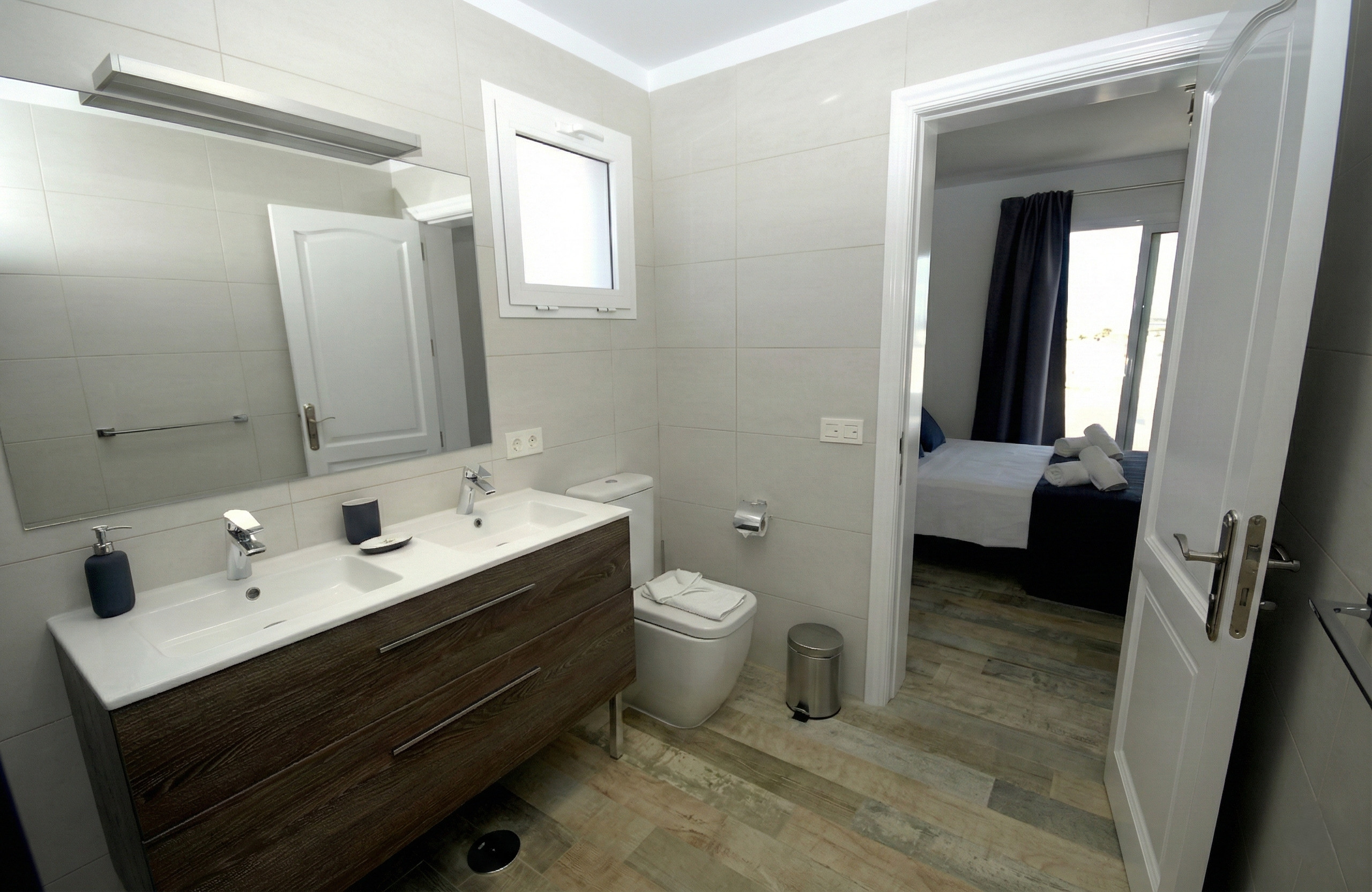 It has 3 very cozy bedrooms. Two double bedrooms with a 1.50m x 1.90m bed and en-suite bathroom and a third bedroom with two single beds and bathroom. The accommodation has 2 modern bathrooms, both with shower tray (recently renovated). Spacious living-dining room with direct access to the outdoor area and a fully equipped kitchen (with dishwasher) with an external laundry area and access to the porch. This layout allows you to enjoy a pleasant outdoor meal after a refreshing swim in the pool or a restorative nap in the sun.