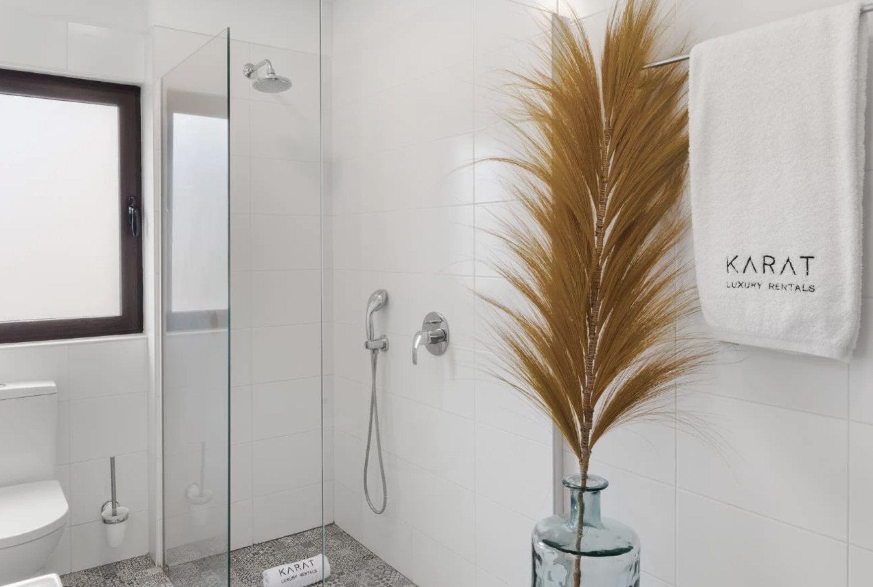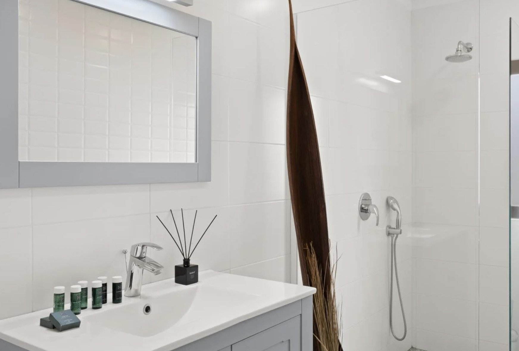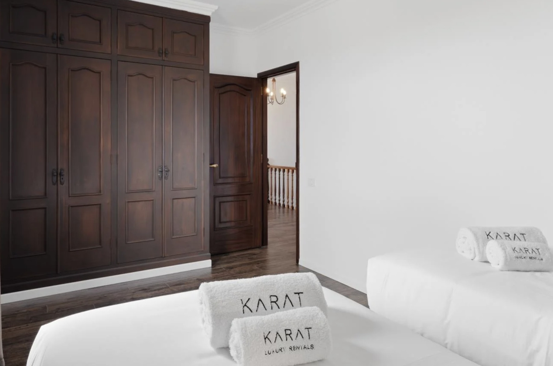 The upper floor is dedicated to rest and serenity. It features four elegant bedrooms: a majestic suite with a double bed (160x200 cm), a second double bedroom of the same size, and two additional rooms, each with two single beds (90x200 cm). There’s also an additional bathroom with a shower.