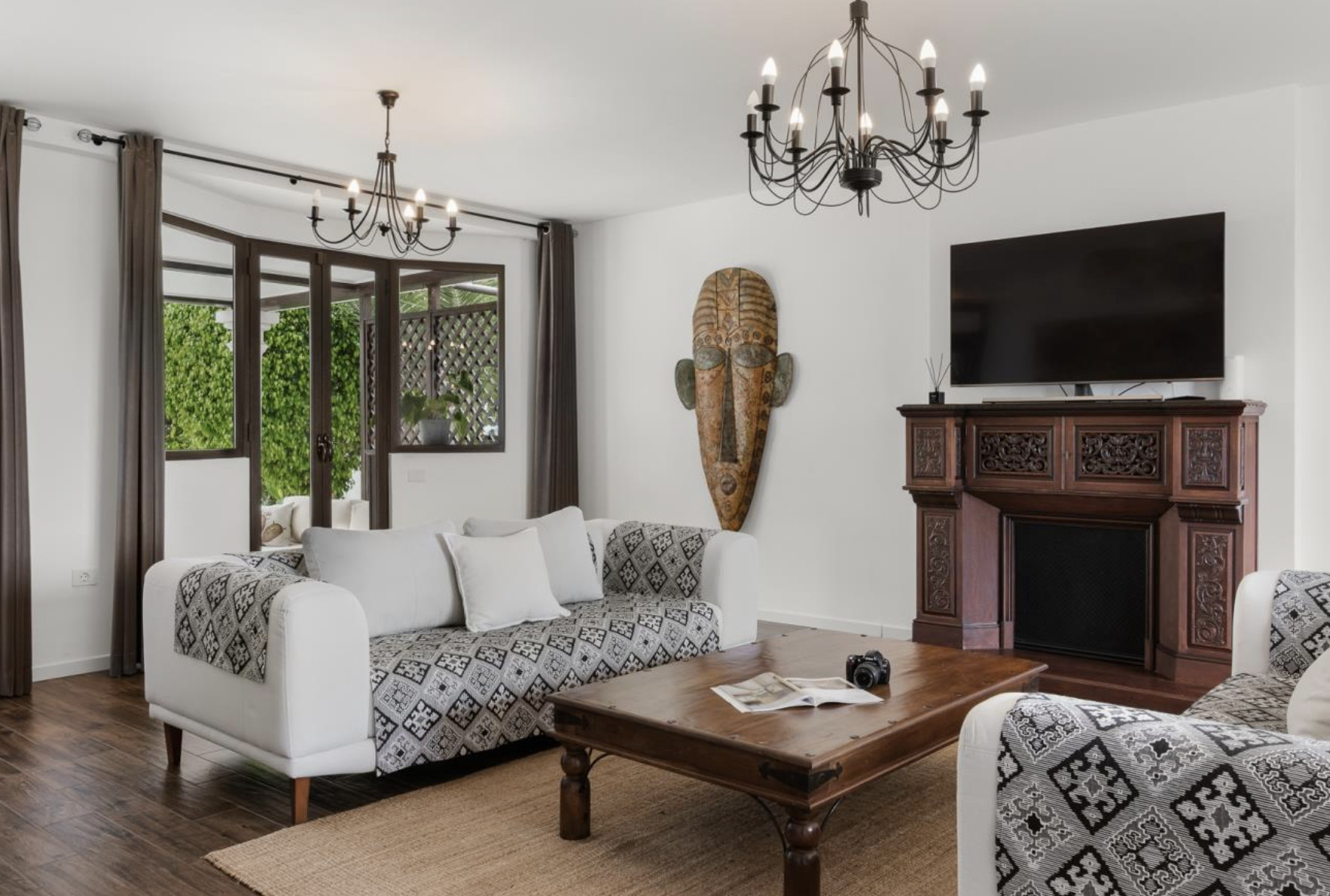 The exterior of the villa is a true relaxation oasis. The rear terrace is equipped with a stylish pergola, a table for eight guests, and a ping pong table. On the main terrace, the jewel of the property: a spectacular heated pool with counter-current and a gradual depth (130-170 cm), ideal for both swimming and exercise. Next to it, a furnished porch with noble wood pieces, a charming chill-out zone, and a large solarium with designer hammocks and auxiliary tables invite you to unwind completely.