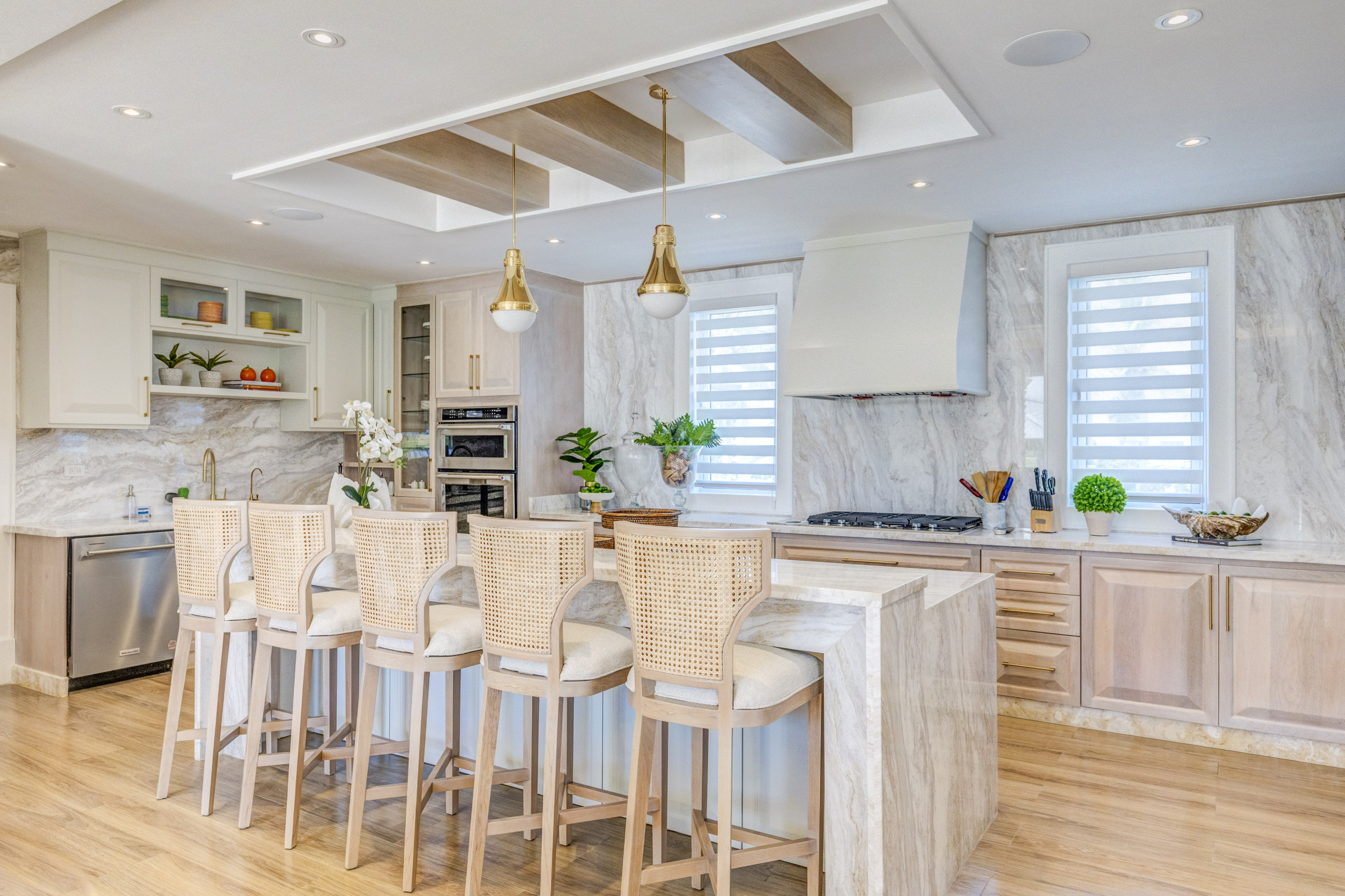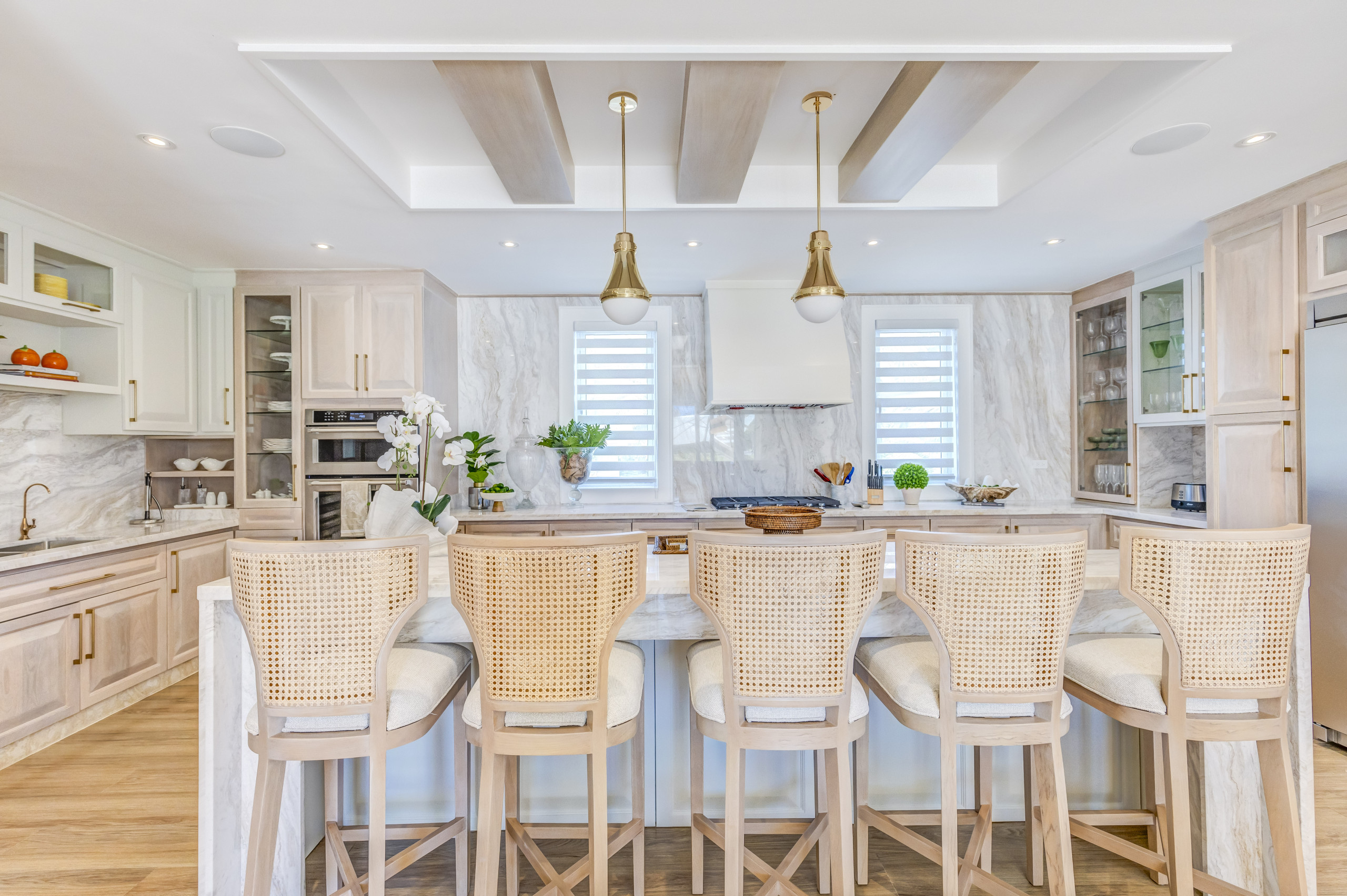 The modern and elegant decor complements the spacious open-concept spaces of the villa, its high vaulted ceilings and large windows that allow abundant natural light to enter. Outside, the rear garden and private pool create an authentic oasis ideal for relaxation and enjoyment.