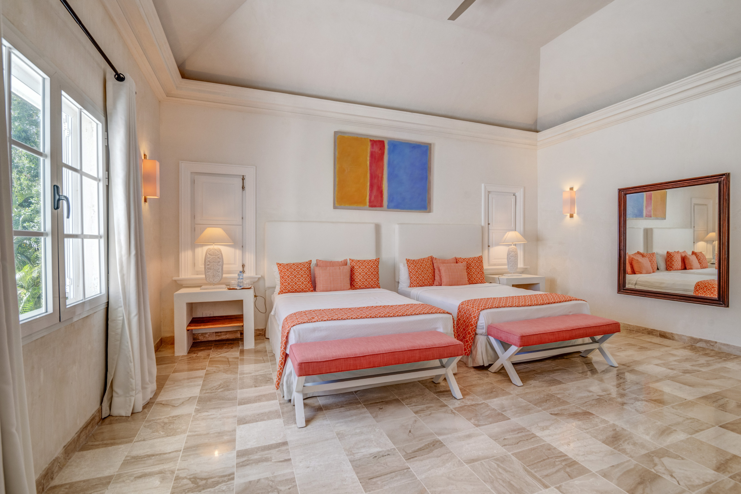 Villa Starfish stands out for its unique, minimalist and modern design with influences from Malibu and Beverly Hills. The pop art style present throughout the house, along with details such as a bicycle hanging from the ceiling and colourful artworks, creates a vibrant, warm and contemporary atmosphere. It is a space entirely designed for those seeking originality, style and comfort in an exclusive Caribbean setting.