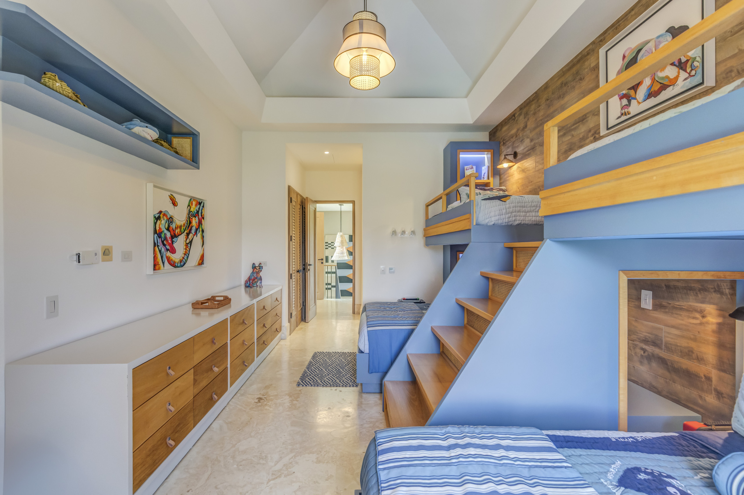 Villa Starfish stands out for its unique, minimalist and modern design with influences from Malibu and Beverly Hills. The pop art style present throughout the house, along with details such as a bicycle hanging from the ceiling and colourful artworks, creates a vibrant, warm and contemporary atmosphere. It is a space entirely designed for those seeking originality, style and comfort in an exclusive Caribbean setting.