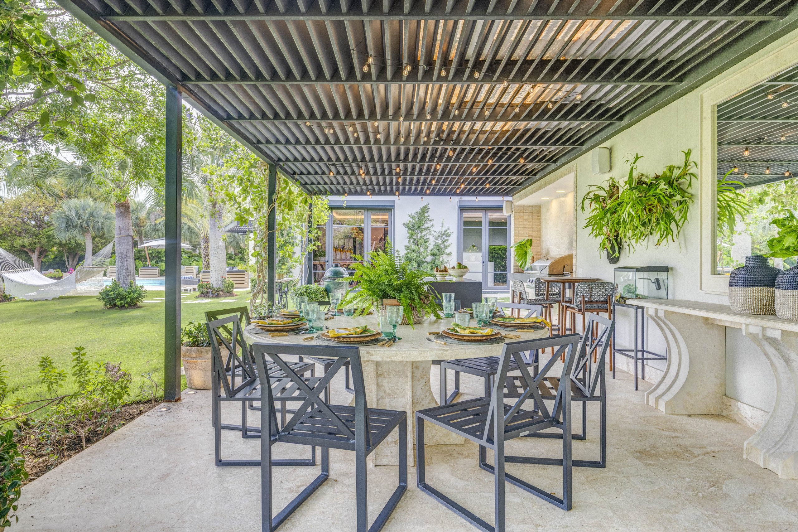 This tropical villa offers an exclusive accommodation experience, with spacious, modern spaces designed for comfort. It features five bedrooms, four with king beds and one with two full beds. The property has a fully equipped kitchen, a spacious living room, indoor dining room, terrace, private garden, and pool. All rooms include air conditioning, television, private bathroom, and walk-in closet.