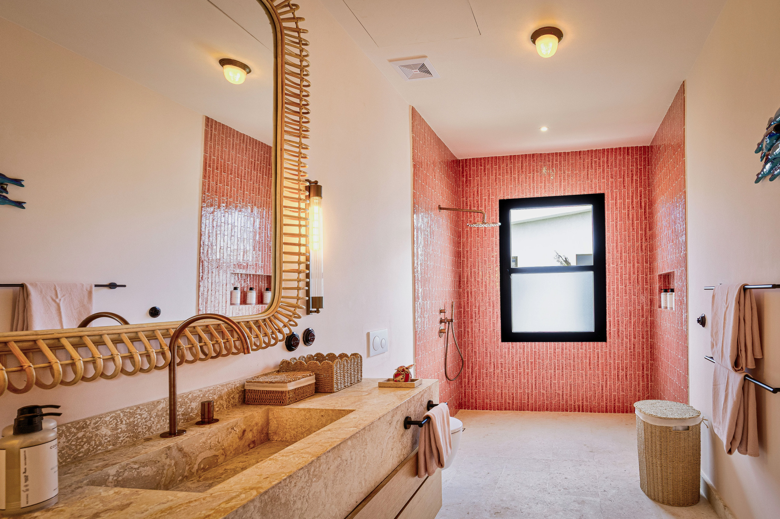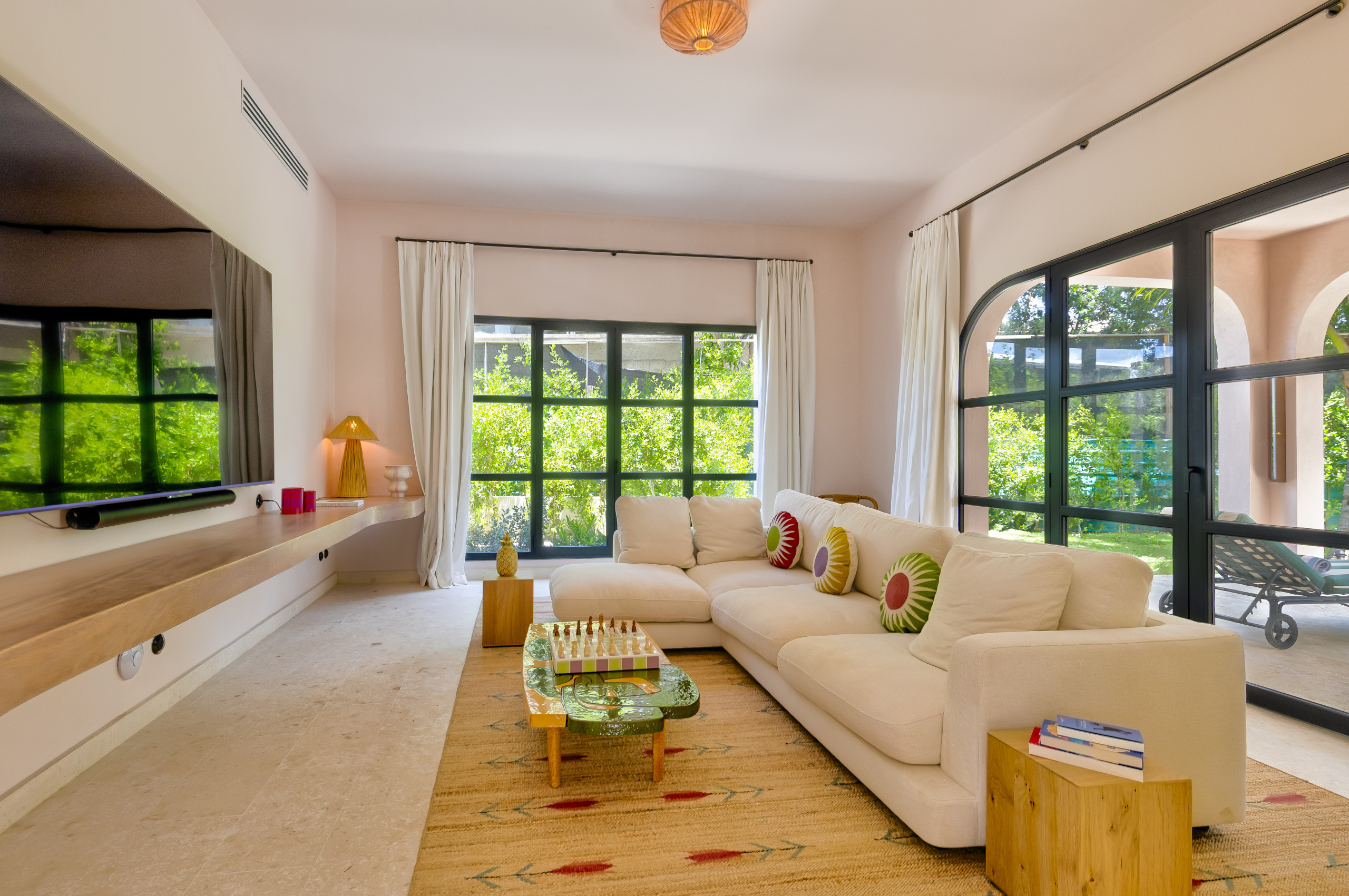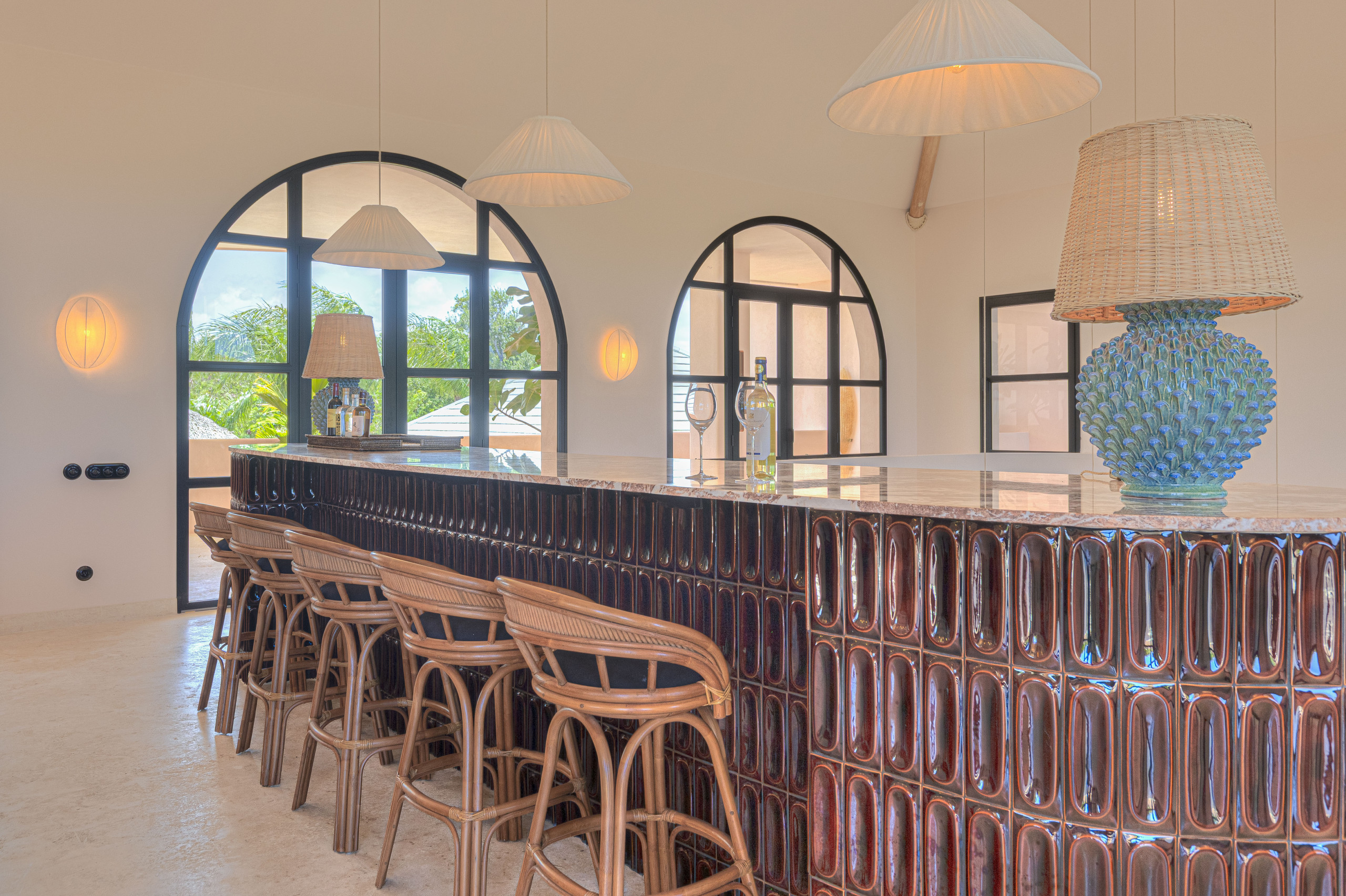 Villa Starfish stands out for its unique, minimalist and modern design with influences from Malibu and Beverly Hills. The pop art style present throughout the house, along with details such as a bicycle hanging from the ceiling and colourful artworks, creates a vibrant, warm and contemporary atmosphere. It is a space entirely designed for those seeking originality, style and comfort in an exclusive Caribbean setting.