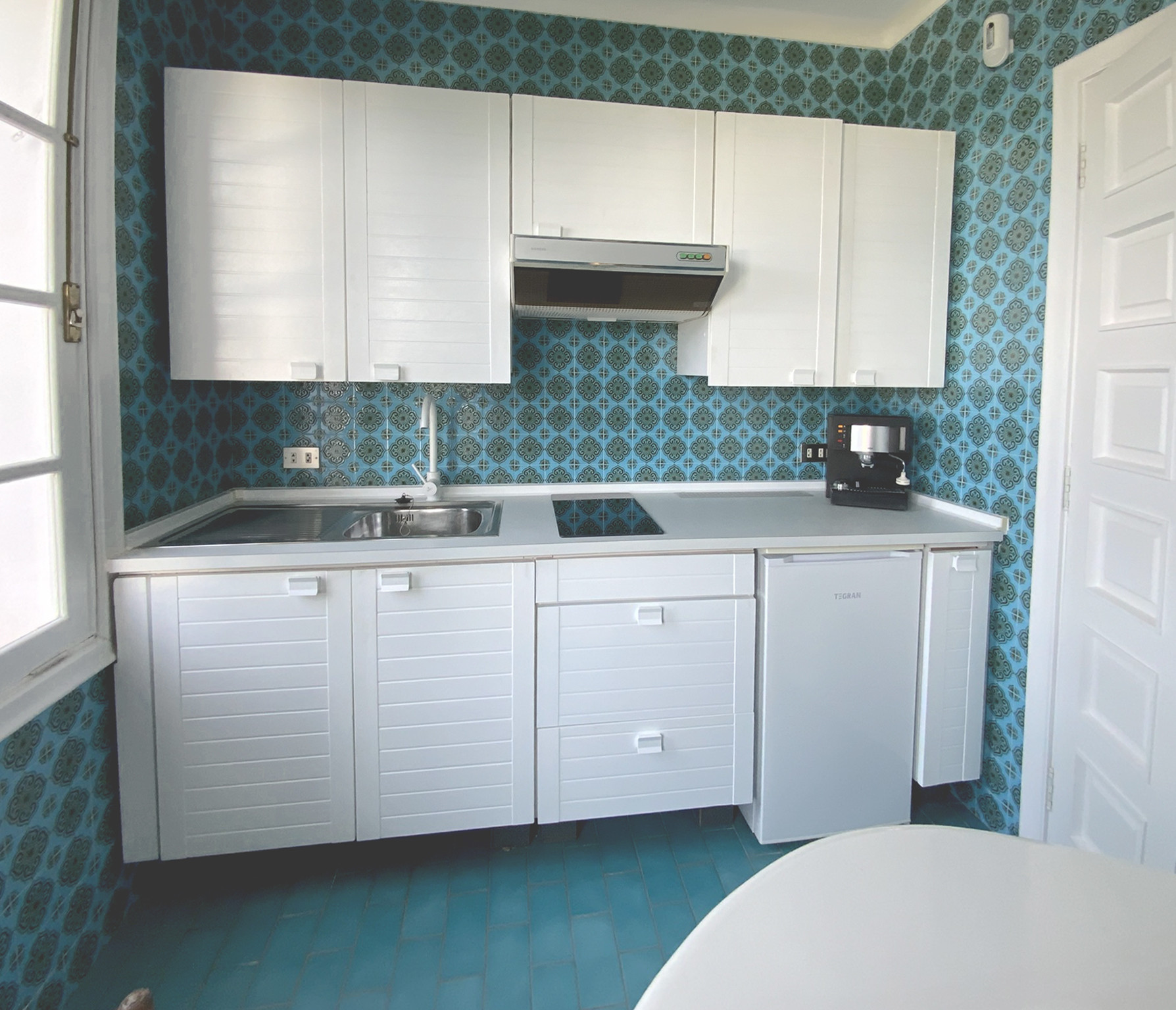 In the hotplate of glass ceramics independent kitchen, refrigerator, oven, freezer, dishwasher, dishes/cutlery, kitchen utensils, coffee machine, toaster and kettle are provided.