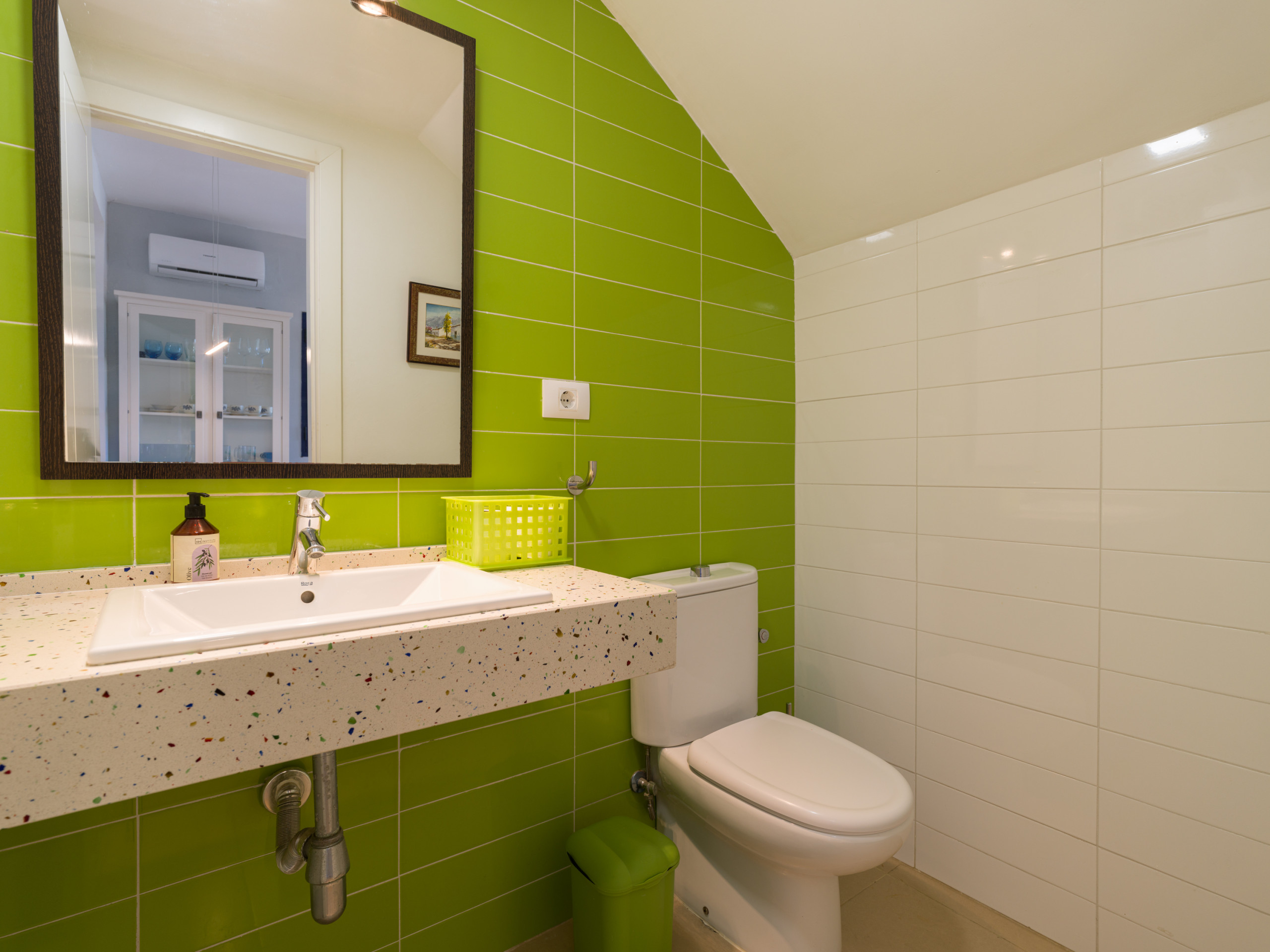 Al primo piano c'è un bel bagno, e due camere doppie, una con un letto matrimoniale e l'altra con due letti singoli. La camera da letto principale ha un bel balcone con vista sul mare.