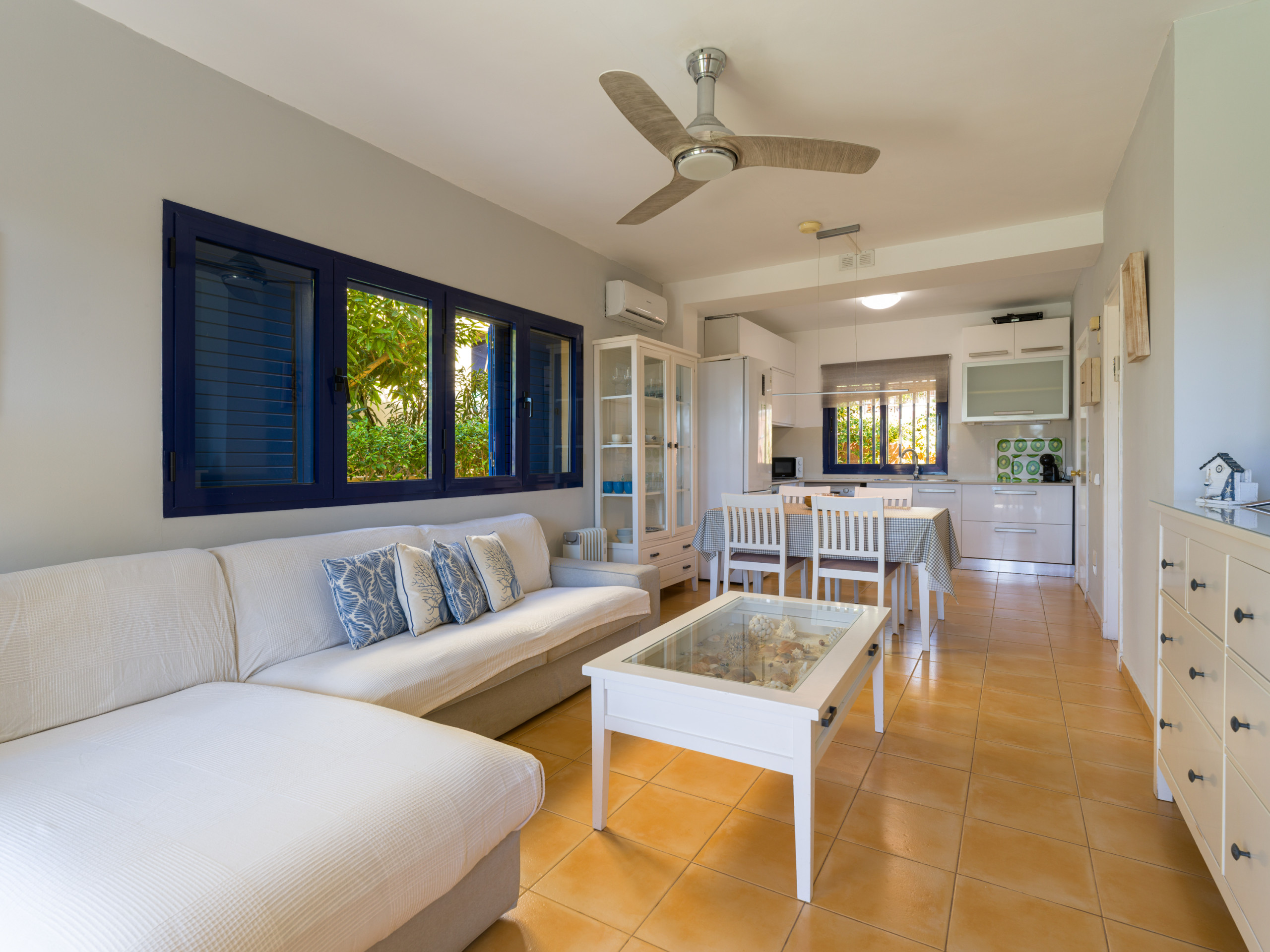 Appartamento di 120 mq arredato con gusto e completamente attrezzato, con ampio giardino e vista sulla piscina. L'alloggio dispone di aria condizionata in tutte le stanze.